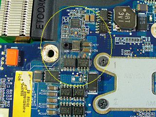 そこで、キーボードを外し、上カバーを液晶表示部毎取り外して中を覗いたら、電源ICのひとつの周りが酷く汚れていました。_左写真&<クリック>_