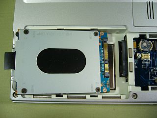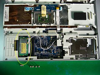 裏側のビス4本と、キーボード下の2本を外して、パームレストを開ければ、左下側に見えます。_左写真_