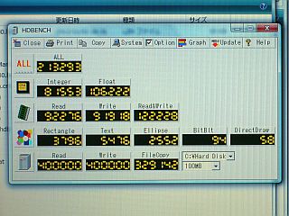 取り敢えず、_当苑定番の_HDBENCHを走らせてみたのですが、これは元々Win2000用だし、SATA-HDDには適していないらしく、もう無茶苦茶な値ですね。_左写真_