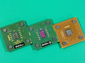 左写真は、_発熱の影響をみるのに_入れ替えてみたAthlonXP CPU達。_左2個はFSB/133MHz対応、右端は100MHz対応_