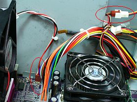 そこで、少々乱暴ですが、代わりに筐体ファンの方を挿して、誤魔化しました。_左写真_