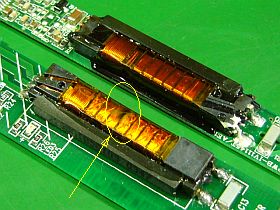 実は、インバータ基板の不良箇所を調べていて、昇圧トランス/高圧コイルに一箇所に小さな焼け焦げを発見。_左写真<クリック>_