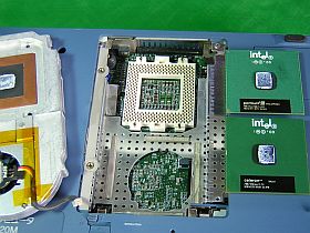 左写真のように、CPUの差し替えをしてみたのですが、残念ながら、クロックは、66MHzの7倍の470MHzにしかならなかった。
