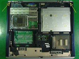 これも、パームレストを外すには、先に「液晶表示部」を外しておかないと、留めビス2本が外せないようになっています。_黄矢印_