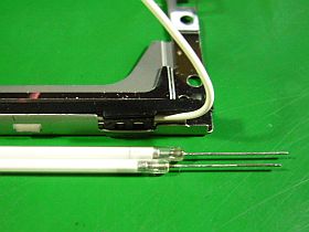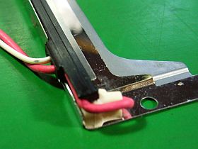 これがあるので白線がブラブラ浮浪者にならず、具合はいいのですが、リード線は「黒い鞘」の方から一旦出した後、「L字型電極キャップ」を通して管の方へ戻すように_つまり大きく廻り込ませるように_しなければなりません。_左写真&<クリック>_
