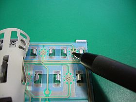 このキーボードは、2枚のシートの内側面に、配線と電極が印刷?されているはずですが、「入力出来ない」場合は、上下接点間に異物が入り込んでいたり、配線との接合部が断線していたりする可能性を考えて、上から見える範囲で調べてみました。