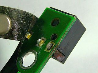 この端子をナイフの先で丁寧にこそげ、更にサンドペーパで磨いたが、半田が満遍なく広がる所までは至らず。_左写真<クリック>_