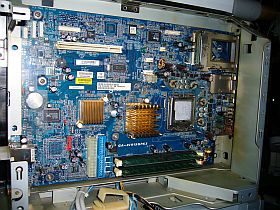 主基板は“汎用品”のようにも見えますが、GA-8I915GPK3という専用基板らしく、液晶信号はLVDS接続、HDDはSATAでした。_左写真<クリック>_