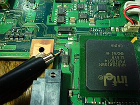 始めはDVDDの不動原因が分からず、端子の半田付け不良を疑って、高温ブロワで半田を熔かしてみたりしました。_左写真<クリック>_ ・・・ 全然、変化無し!