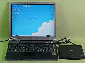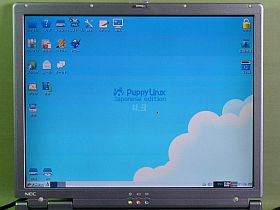 そこで、上記のPuppy Linuxを、外付けCD-ROMから読ませてのテストをしました。これだと、画面1024x768ドット、64K色もOKなのが、簡単に分かりました。_左下写真_