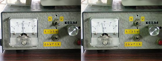 休止状態では、いずれも1A前後(左写真<クリック>)ですが、処理・動作を始めると、どちらの電圧ででも電流は2A前後になり、ピークでは、2.5A位になります。(左写真)