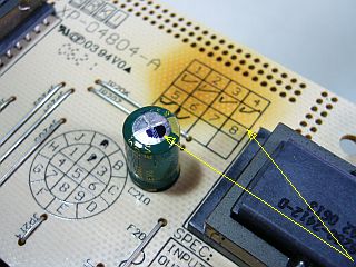 (手元に届いてから、)分解して調べた結果、不動化の原因は、電源回路内の電解コンデンサの不良化だったようで、それを手持ち品と交換したら、見事に治ってしまった♪