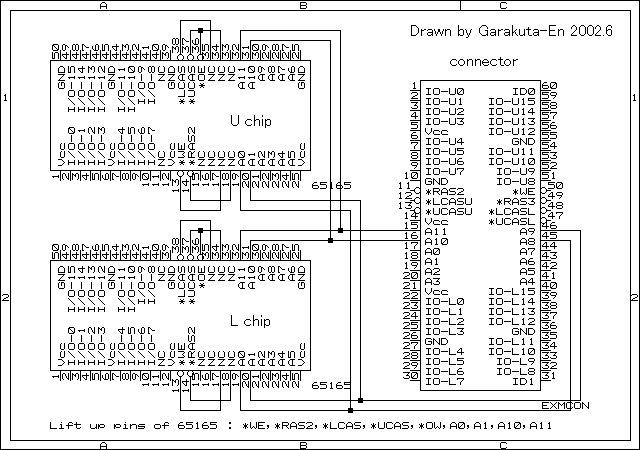 The each pin of *WE, *RAS, *OE, *UCAS and *LCAS should be tied to its suitable land. Then tied the A0, A1 pin to the A8, A9 of the connector, and the A10, A11 pin to the A10, A11 of the connector, respectively.