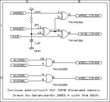 The connector for the expanded memory gives two bank selectors as *RAS2 (pin #11) and *RAS3 (pin #49). Each will be able to access to 16MB area respectively. However, *RAS3 may not connect to the chips directly (because the chip has not distinctive pin for additional select signal), so the half area of 32MB will not be able to access.