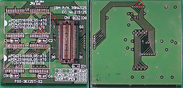 Before mounting 128Mbits chips on the 4MB board, you have to cut the circuit pattern of 4 address lines (A0, A1, A10, A11) and 1 selecting line(*RAS2) at suitable locations. The left picture shows such locations with red circles.