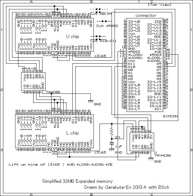 The pins of *WE, *RAS, *OE, *UCAS and *LCAS should be lifted off from the base, and be tied to each suitable land. The right picture shows the wiring diagram.