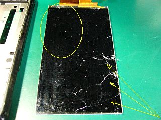 「液晶パネル」のヒビ割れは、途中ではあまり良く分からなかったが、取り出して見ると彼方此方で割れていた。こりゃ駄目だ!(図9)
