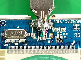 左写真とその<クリック>は、USBプラグを(無理に)半田付けで取り付けた様子。(60Wの半田鏝を使用)