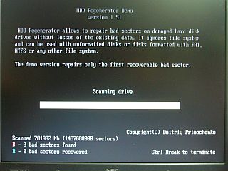 さて、「SMARTエラー」はど派手なのだが、これを改善する方法は無さそうなので、せめても、「セクター修理」をやってみようと、「HDD Regenerator」を走らせた。(左写真&<クリック>)