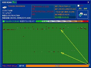 そこで、彼の有名な(フリーソフト)「HDD SCAN(DRTC-HDDSACNv20)」を使わせて頂いて、HDDの欠陥の分布状況を見たら、結構、帯状団子で、ほぼ2領域に集中しているようだ。(左写真)