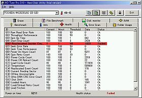 止む無く、この不良?HDDに、Win98,Win2000を載せて、その上で「HD Tune Pro」試用版を走らせてみました。結果は、左上図&それの<クリック>のようで、“代替セクタの使い過ぎだ!”?でも、数字が変だけど...