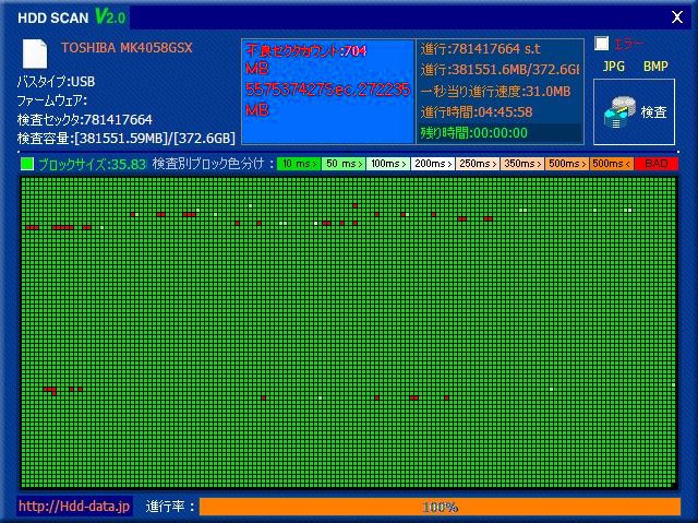 結果を「HDD SCAN」で見ると、むしろ欠陥セクター数は減った!(左図&<クリック>)