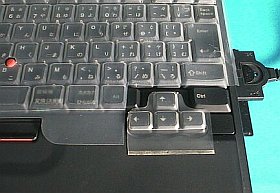 ここは思い切って、カバーの矢印キー部だけを切り外して乗せる事にしました。(サイズは、ピッタリ!)でも、触れる度に動くので、端を両面テープで止めました。(しかし、どう見ても格好が悪いですね)