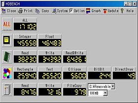 で、組み込んでから、HDBENCHを走らせたら、先回のCF-16GBとほぼ同じALL値。でも、HD値はかなり小さいです。(左上図)