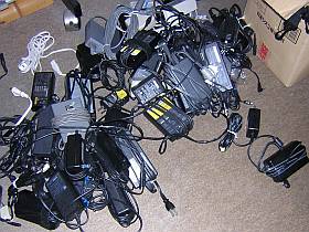 差込み口には、ちゃんとプラグの形状や「DC-IN 16.5V」、+,−のピン位置も書かれているので、直ぐ見付かるだろうと高を括っていましたが、何せダンボール箱一杯ですから全部ぶちまけないと...(けど、こいつら、増える一方だ!)