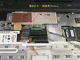 今回の新入手品は、キーボードの取り外しに関しては、どうやら否定的なようです。と言うのは、ビスで留めるキーボード拘束用フィルムが付いていたからです。多分、"キーボードを開けるのは、メモリの入れ替えのためだけよ!"という想定なのでしょう。