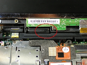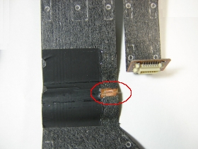 次に、本体カバーを開けた時にフラット・ケーブル(フレキ)を突付いてみたら、一瞬点灯する時があって、そこを良く見ると、微かに「折れ」が生じているような感じ。(左の写真、丸印の箇所)
