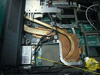 でも、ネット情報の中に、「汎用miniPCIスロット」(筐体中の左側)が使えるとあったので、そこに(上で弾かれた)ハーフサイズのカード「Intel Centrino Advanced-N + WiMAX 6250](Model :622ANXHMW)を挿してみた。(図5、図6<クリック>