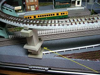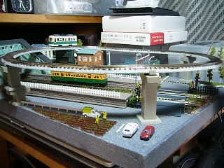 当初は、これの周辺にボードを足して、線路を敷くことを考えていたのだが、取り敢えず、先日、ジャンク・レール群で組んだループを、橋脚を使って上に乗せてみた。(図4<クリック>)