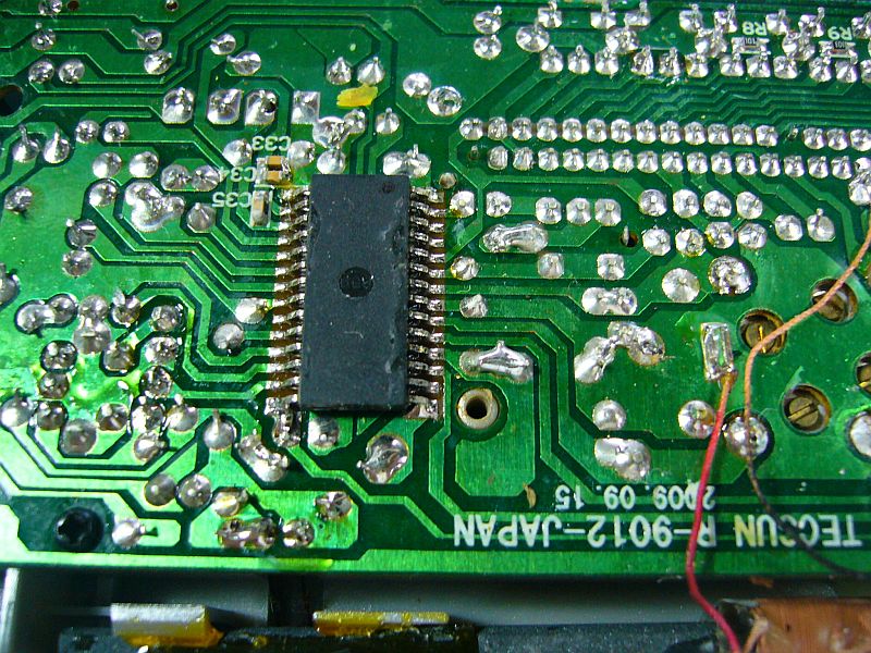 回路を調べるのには、ICとその応用回路を調べるのが適当なのだが、これの主ICは、裏返しに半田付けされていて、「品番」を読むことが出来ない。(図5)