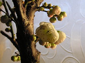 本来なら来春のはずなんだが、部屋が暖かいせいか、はたまた世の中の気候がとち狂っているせいか、急いで咲かせてしまったらしい。(この木も、多少性急なのか?)