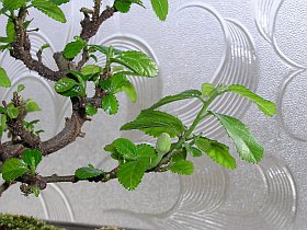 どうも、水のやり方が悪く、不足気味ではないかと気が付いて、朝一番にたっぷりやるようにしたら、今度は枝の先端に近い所の葉が元気良く開いて来た。(左写真の<クリック>で、その様子)
