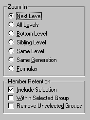 The Zoom In option group contains items that enable you to customize drilling behavior. You can specify which members are returned to the worksheet during a drill-down operation. For example, if you select Bottom Level, Essbase retrieves data for the lowest level of members in a dimension. With this option, a drill-down on Year retrieves Jan, Feb, Mar, Apr, May, Jun, Jul, Aug, Sep, Oct, Nov, and Dec.