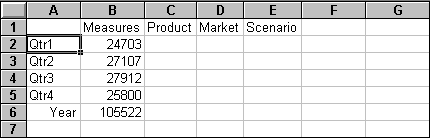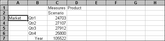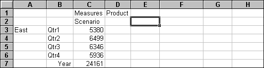With Essbase, you can drill down to various levels of multidimensional data in the worksheet. For example, if you want to view data for a specific quarter or month rather than an aggregate data value for the whole year, you can drill down on the Year dimension to see more detailed data.