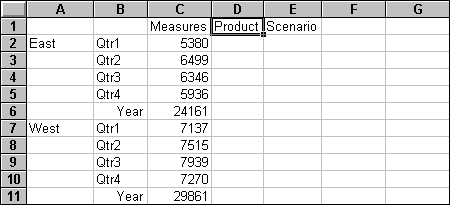 With Essbase, you can retrieve members into grouped, or nested, columns or rows. Row groups containing more than one level of data are nested within single-member row groups. For example, a row group containing Qtr1, Qtr2, Qtr3, and Qtr4 may be nested within a single-member row for a specific region, such as East (see the following illustration). Drilling down to lower levels of database members is one way to retrieve data into nested groups.