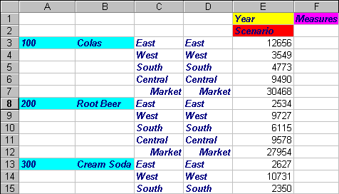 Essbase changes the Product codes (100, 200, and so forth) to their predefined aliases (Colas, Root Beer, Cream Soda, and so forth). In the Sample Basic database, Product is the only dimension with predefined aliases.