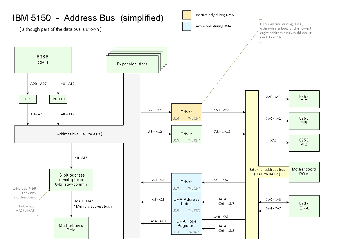 - The low 13 bits of the address bus are put onto the external address bus by driver chips U15 and U16.