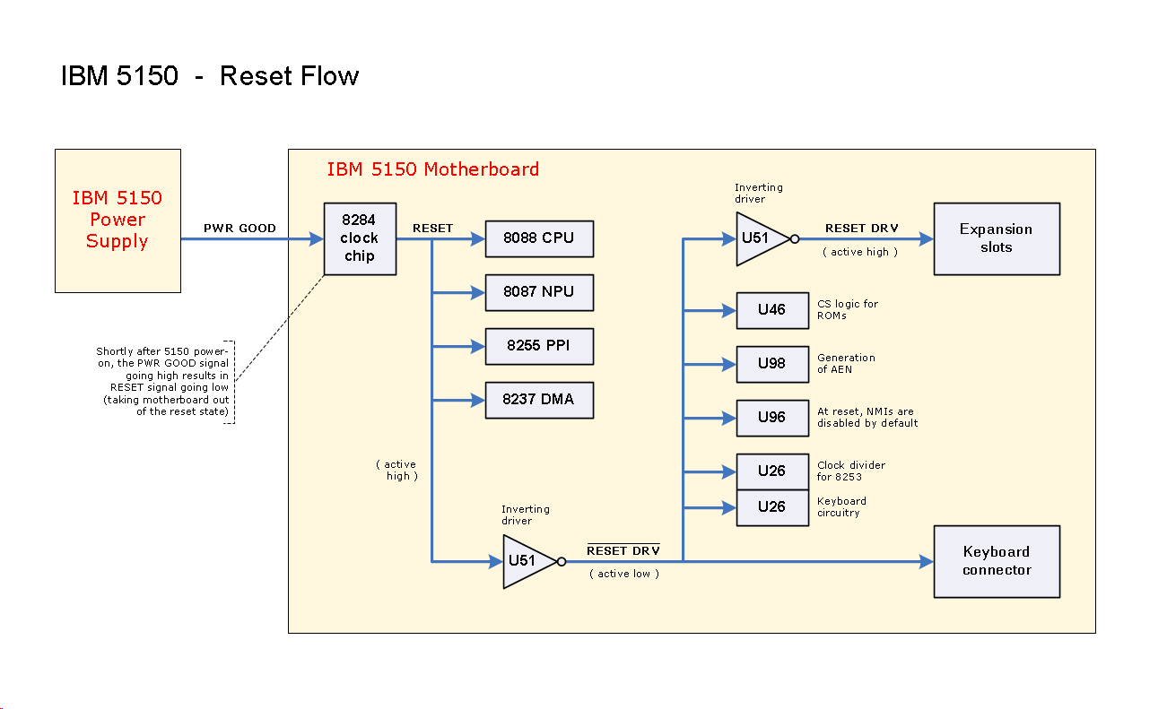 7. When the 8284A chip sees the power supply's POWER GOOD signal go high, it takes the motherboard's RESET line from high to low.  As a result, chips are taken out of the reset state.
