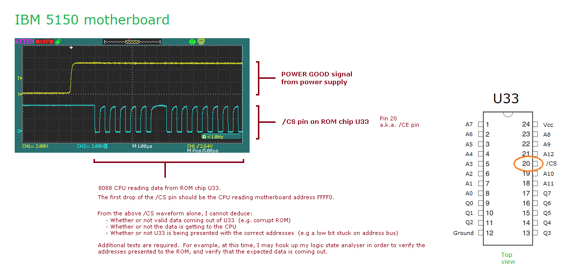 - Certain circuitry establishes that motherboard address FFFF0 corresponds to ROM chip U33, and accordingly, drops the /CS pin (/CE pin) on ROM chip U33.  See here and here.