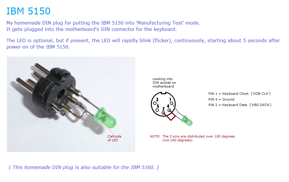 | • | In MANUFACTURING TEST mode, the POST gets channel #0 on the 8253 timer chip to trigger a "BLINK LED" operation. Earlier, channel 0 of the 8253 timer was set to output a square wave of about 18.2 Hz, so, at about 18.2 Hz, a subroutine ("BLINK_INT") is run that toggles the PB6 pin (bit 6 of port B) of the 8255 chip. Per here, the PB6 pin going LOW pulls the keyboard clock line ('KBD CLK') on the motherboard's keyboard DIN connector to LOW. The result is a square wave of about 9.1 Hz on the keyboard clock line on the motherboard's keyboard DIN connector. So, presumably, for MANUFACTURING TEST mode, IBM plugged a custom device into the motherboard's keyboard DIN connector. The device: - Grounds the keyboard data line ('KBD DATA'), so as to put the POST into MANUFACTURING TEST mode; and - Has a LED connected between ground and the keyboard clock line ('KBD CLK'). My homemade device, which includes the LED, is shown at here. It has been observed that the LED blinking will not be seen if an MDA video card is fitted and the motherboard's video switches are set to CGA, or, a CGA video card is fitted and the motherboard's video switches are set to MDA. Yet to investigate why that is. If no video card is fitted, set the motherboard's video switches to EGA. ![]() |
