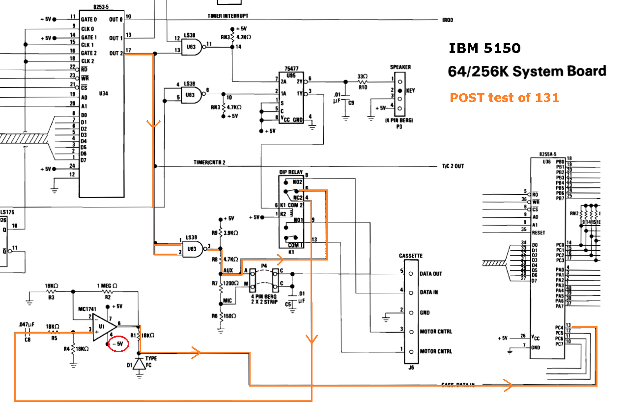 | 131 displayed on-screen | Failure of cassette port wrap-around (loopback) test. Wrap-around diagram at here. Some possible 131 causes: • 5150 motherboard of type 64KB-256KB is not receiving minus 5 volts (chip U1 on the 5150 motherboard requires minus 5 volts). - Try reseating plug P9 from power supply, in case of bad connection. - Perhaps in use is an ATX power supply (via adapter) that does not have a minus 5 volts output. • Faulty motherboard - see note 3 for more information. |