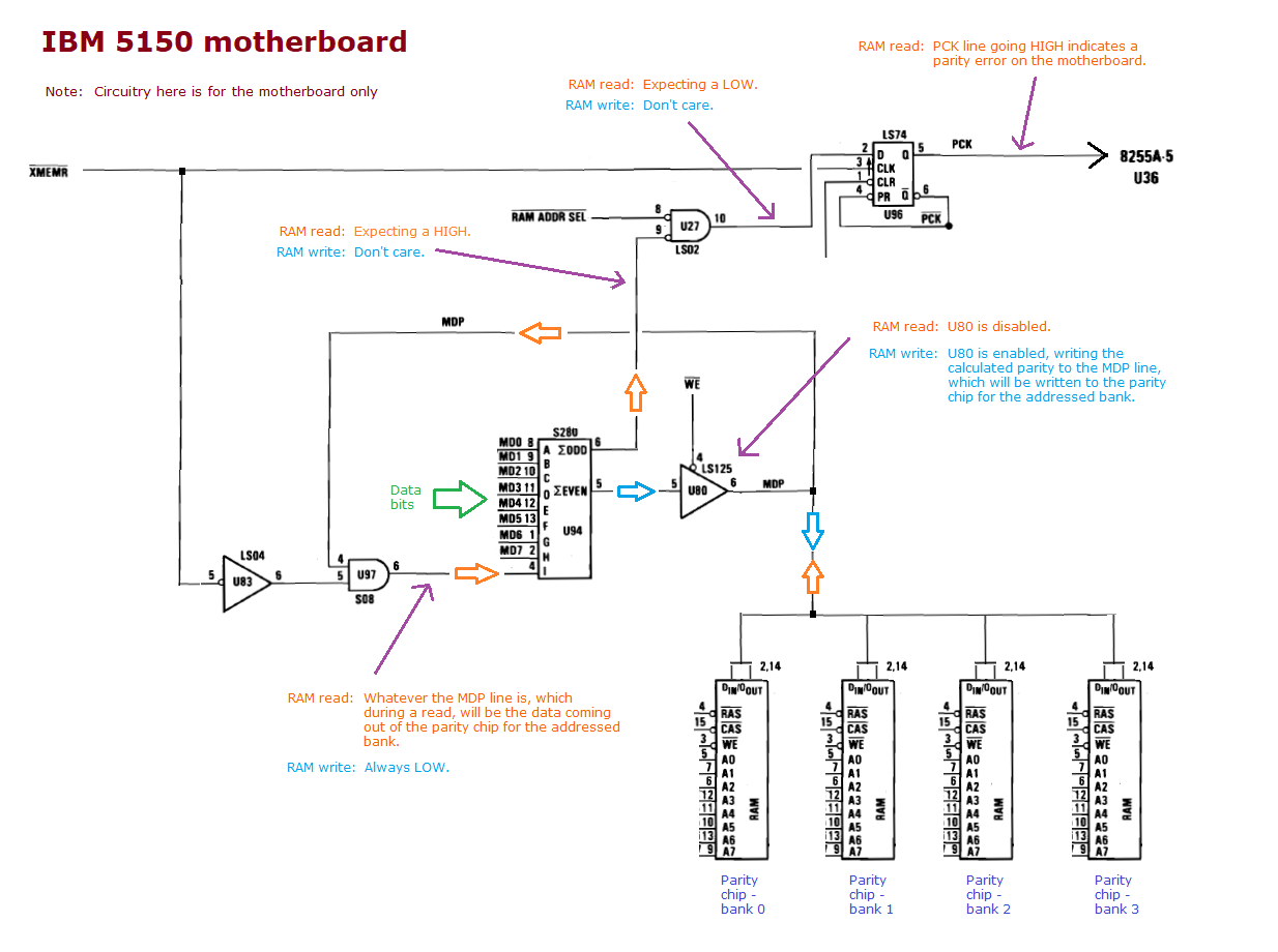 | Note 1 | If intermittent: • Verify that the mains AC power (house power) fed to the computer is within specification and stable. Someone on the Vintage Computer Forums indicated that the cause of their intermittent PARITY CHECK errors was their air conditioner (when the compressor kicked in/out). • The computer's power supply may be the cause. • Bad RAM chip/s may be the cause. • Bad RAM support circuitry may be the cause. (One example: bad filter capacitor/s close to the RAM chips.) • In case of poor electrical contact, try re-seating the RAM chips in their sockets. |