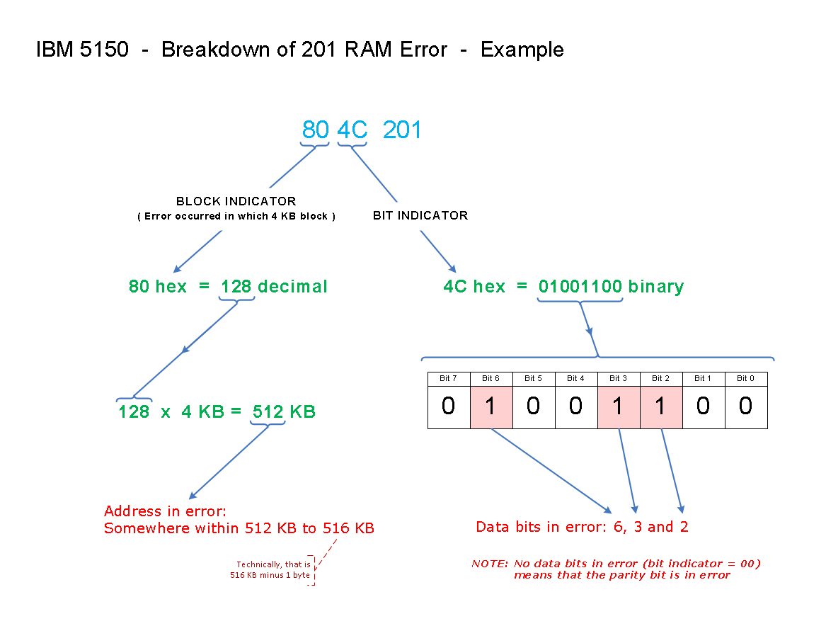 If a problem is found in the remaining RAM, a 201 type error is reported on-screen.  The format of a 201 error produced by a 5150 is "aabb 201".  An example is "0510 201".