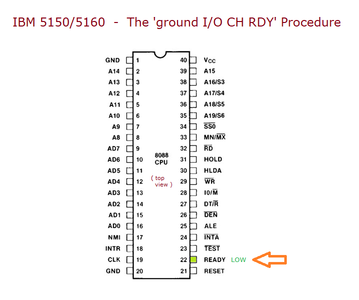 | Step 3.1 | Power on the motherboard, then verify that pin 22 (the READY pin) of the 8088 CPU is LOW - see here. |