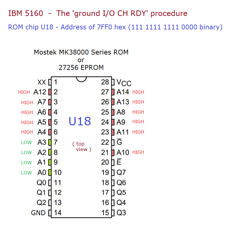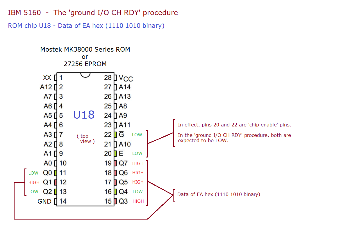 | Step 7.2 | If an IBM 5160, on the data pins (D7 to D0) (Q7 to Q0) of ROM chip U18, expect to measure the data of EA hex (1110 1010 binary). See here. |