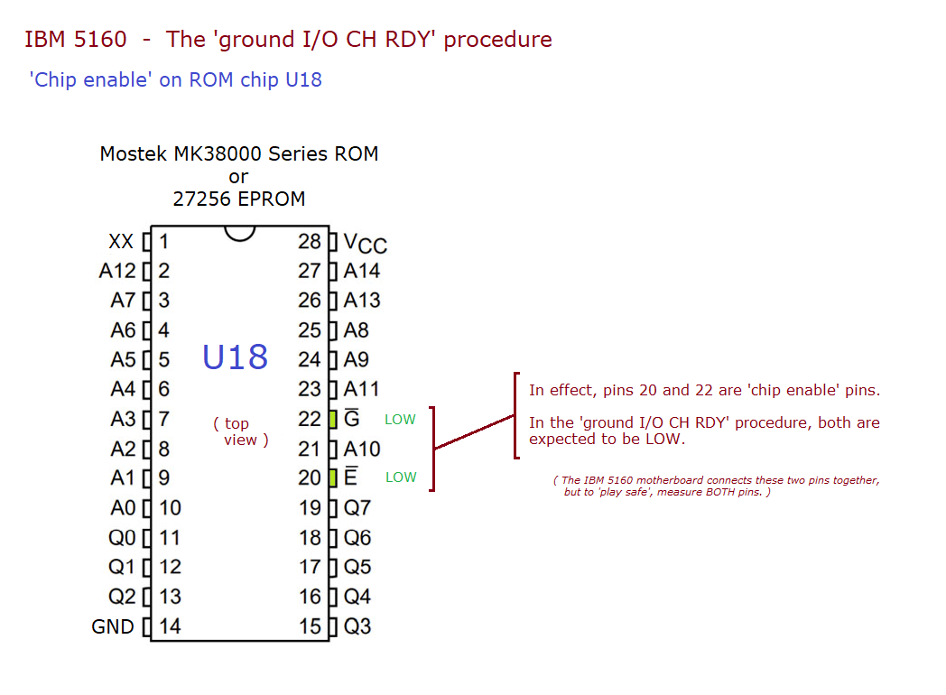 | Step 6.2 | If an IBM 5160, verify that pins 20 and 22 of ROM chip U18 are LOW. See here. |